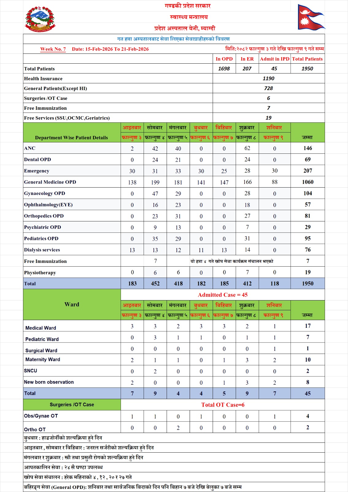 प्रदेश अस्पताल, बेनी, म्याग्दीबाट मिति २०८२ फाल्गुण ०३ गते देखि २०८२ फाल्गुण ०९ गतेसम्म सेवा लिने सेवाग्राहीहरूको विवरण।