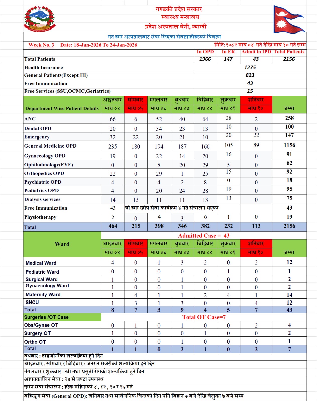 प्रदेश अस्पताल, बेनी, म्याग्दीबाट मिति २०८२ माघ ४ गते देखि माघ १० गते सम्म सेवा लिने बिरामीहरुको सङ्ख्या।